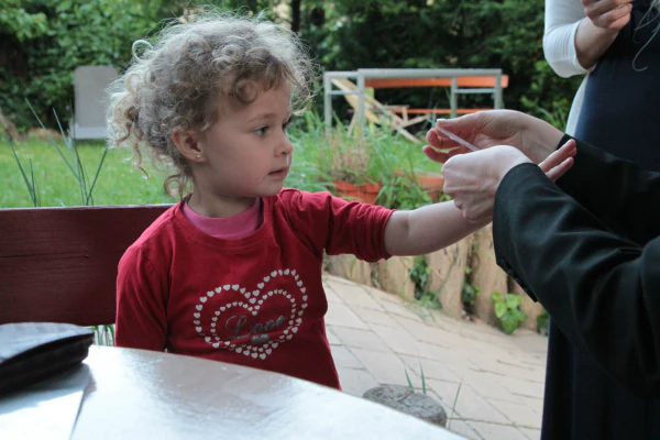 Bár itt úgy tűnik, mintha Lili épp szurira várna, az arcán valójában lelkes várakozás látható; azt kémleli, vajon hogyan sikerült feltennem a mintát alkarjára.