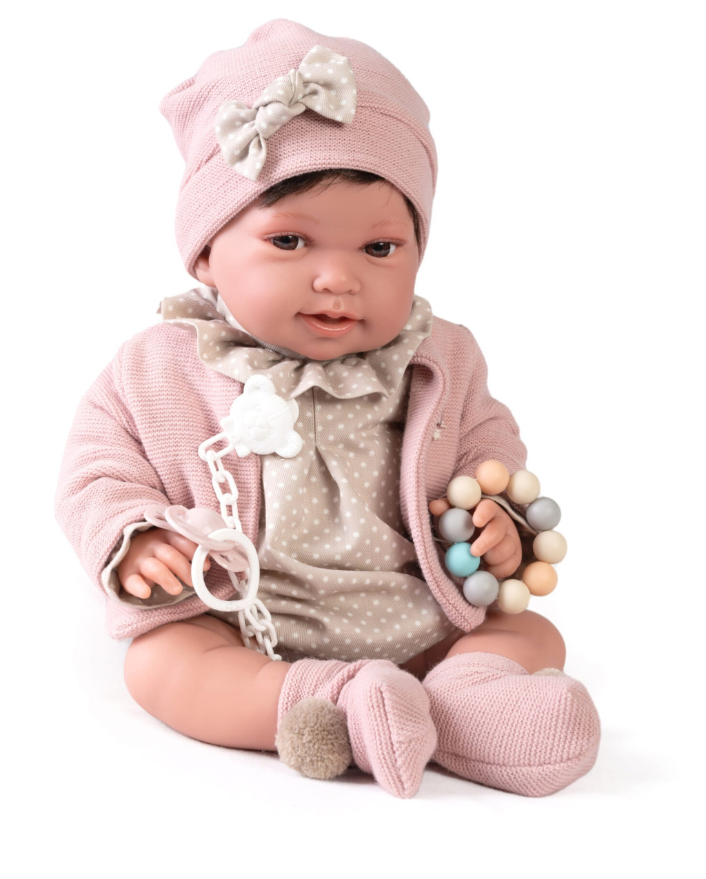 Pipa az újszülött, élethű baba pöttyös ruhát, kötött kabátot, sapkát és zoknit visel. Hát nem édes? A babának cumija és játéka is van, így sosem unatkozik majd.