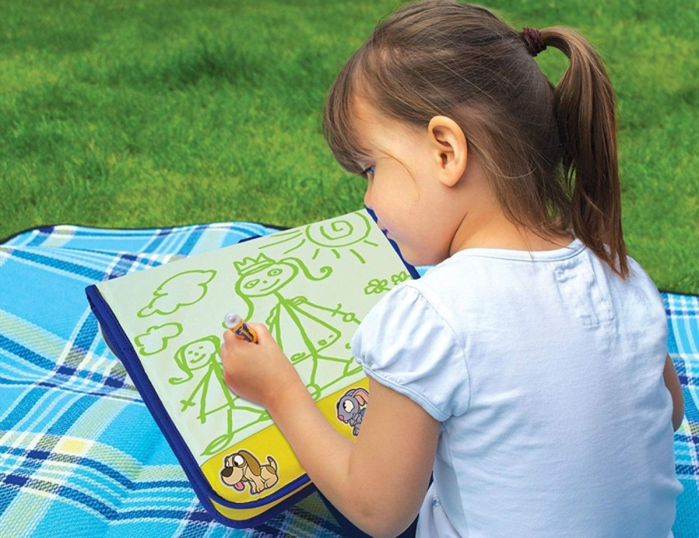 Hosszú útra mentek vagy csak a strandra? Itt a tökéletes játék, hogy ne unatkozz az úton. Csak nyisd ki a hordozható táskát, töltsd meg vízzel a tollat és már rajzolhatsz is. Mindkét lapjára rajzolhatsz, ha pedig betelt a lap, akkor várj egy kicsit, amint megszárad az oldal, eltűnik a tinta, ismét kezdheted a remekművek készítését.