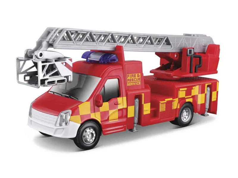 Tűzoltó teherautó forgótányéros létrával. Ez a valósághű Burago tűzoltóautó minőségi, tartós műanyagból készült, így ideális a teherautó játékhoz, hátulján mozgatható forgótányéros létra van rögzítve. Remek kiegészítője bármilyen gyűjteménynek. A kerekei mozognak.