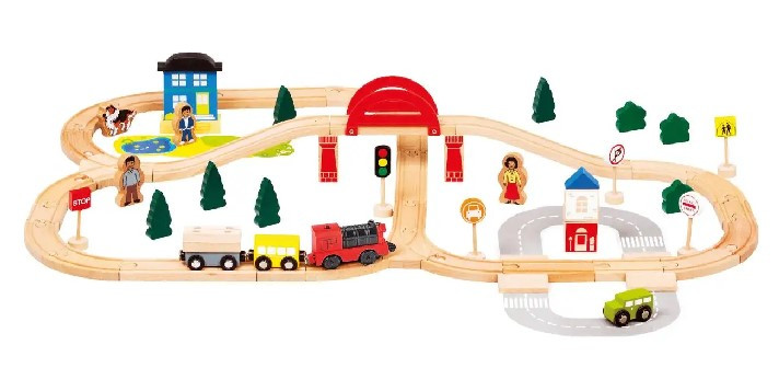 Ezzel a Bino fa vasúti készlettel egy teljesen egyedi és változatos vasúti pályát építhetsz, melyben 70 db számos kiegészítő, épület, jármű és zöldterület található. A gyermekek órákon át szórakozhatnak a kreatív játékkal, melynek rétegelt lemez és tömörfa alkatrészei masszívak és tartósak. A mozdony 2 kocsival, járművel, 4 figurával, 28 pályadarabbal és 34 kiegészítő darabbal rendelkezik, valamint golyós elektromos meghajtással működik (1×AA elem szükséges, nem tartozék). A készlet kompatibilis más gyártók vonataival is, így a lehetőségek szinte végtelenek! Ne hagyd ki ezt a fantasztikus lehetőséget, és vidd haza a saját vasúti világodat még ma! A játék 3 éves kortól ajánlott.