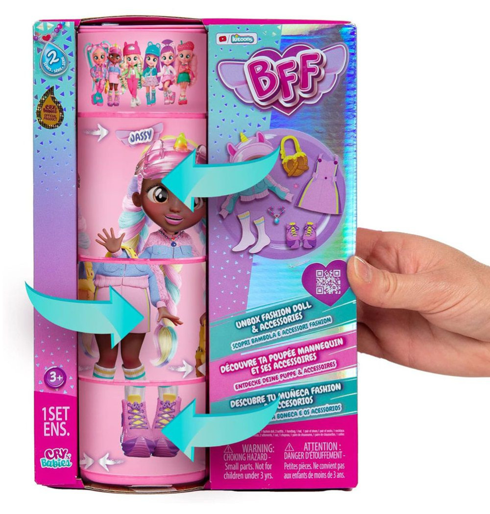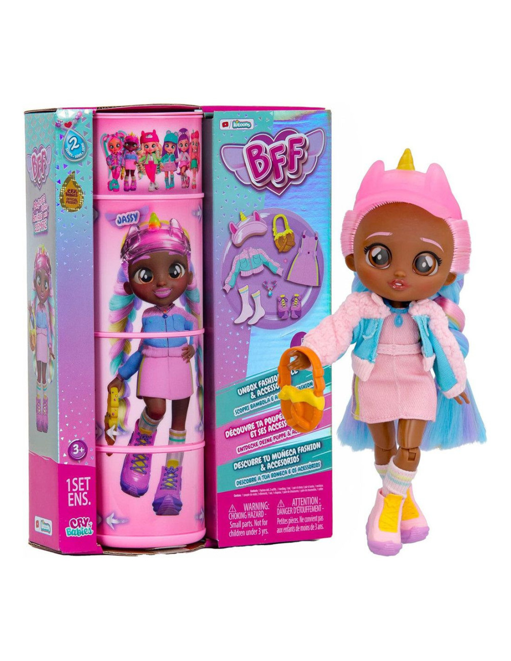 A Cry Babies BFF egy gyűjthető divatbaba, amellyel kifejezheted magad, kísérletezhetsz a divattal és azonosulhatsz a kedvenc karaktereiddel a Cry Babies Magic Tears animációs sorozatból. A baba 20 cm magas, 15 cm hosszú, selymes nejlonhajjal és rengeteg divatos kiegészítővel rendelkezik. A baba teste 6 rugalmas ízülettel rendelkezik a pozicionáláshoz. A csomag mozgatható, forgatható hengerekkel rendelkezik, így a baba különböző pózokat vehet fel. A csomagban a baba mellett 9 darab kiegészítő is található: 2 ruhadarab, egy táska, egy kalap, egy pár hozzá illő cipő egy pár zoknival és egy nyaklánc!