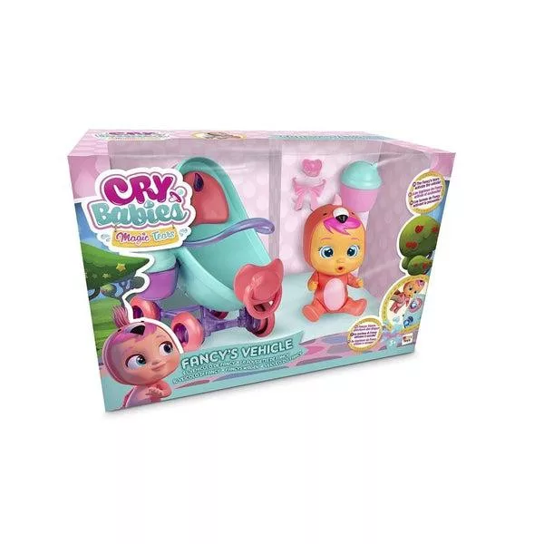 Szerezd be a Cry Babies világából már jól ismert Fancy babát és a különleges babakocsiját! Helyezd a babakocsi pohártartójába a feltöltött cumisüveget és már indulhattok is sétálni. A séta közben megéhezett babát megitathatod a cumisüvegben lévő vízzel. Ha tele a pocakja, akkor varázskönnyeket tudsz előcsalni. Csak a varázskönnyek képesek előcsalogatni a babakocsiból a buborékokat. A felszálló buborékok látványát imádják a babák. A friss levegőn tele pocakkal hamar elálmosodik a csöppség. Dönts le a babakocsit, hogy a baba kényelmesen, fekve tudjon szunyókálni.