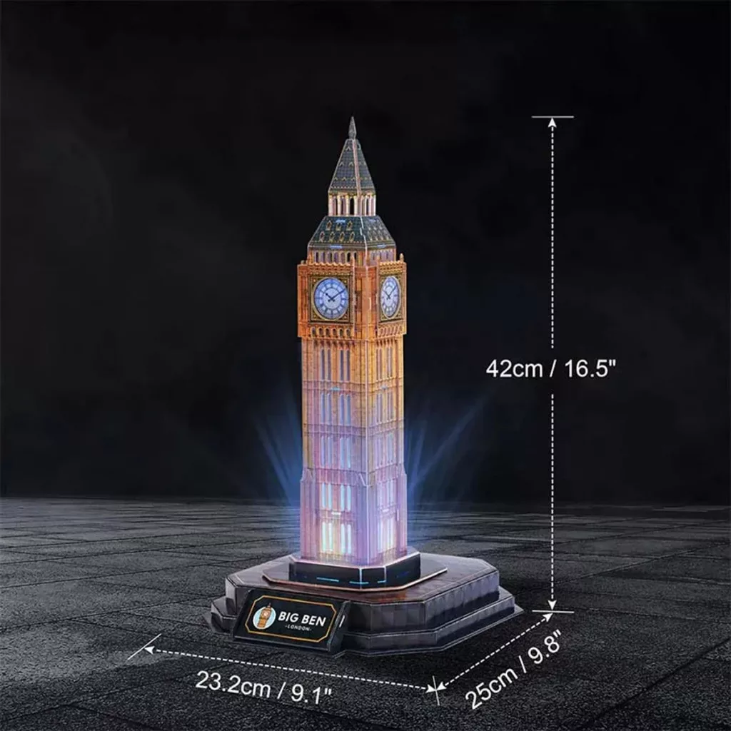 A Cubic Fun puzzle kirakása izgalmas szórakozást nyújt a gyerekeknek és az építészeti gyűjtőknek a világ különböző pontjairól. A Big Ben LED szett csomagjában 32 darab puzzle található, amelyek egy speciális, habszivacsra emlékeztető anyagból készültek. A puzzle-k számozottak, kivágottak és lapokra vannak helyezve. Egyszerűen, erőszak nélkül préselje ki az elemet a lapból, és szerelje össze a mellékelt útmutató szerint, ragasztó vagy speciális szerszámok használata nélkül. A kész építményt egy állványra helyezik, amelyben LED-ek vannak. Az így megvilágított építmény 3D puzzle-ből, lekapcsolt fénynél fenomenálisan néz ki.