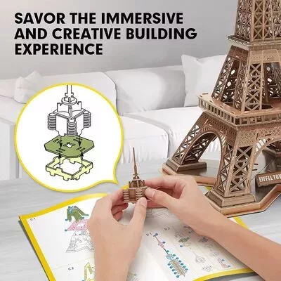Ragasztómentes összeállítás. Az előre kivágott, precízen illeszkedő daraboknak köszönhetően nincs szükség ragasztóra vagy ollóra, így a folyamat tiszta és egyszerű. National Geographic tájékoztató füzet. A csomag egy fotókkal illusztrált füzetet is tartalmaz, amely bemutatja Párizs és a torony nevezetességeit. Impresszív méret A 80 elemből álló modell összeállítva eléri a kb. 70,9 cm-es magasságot, ami garantáltan magára vonzza a tekinteteket.