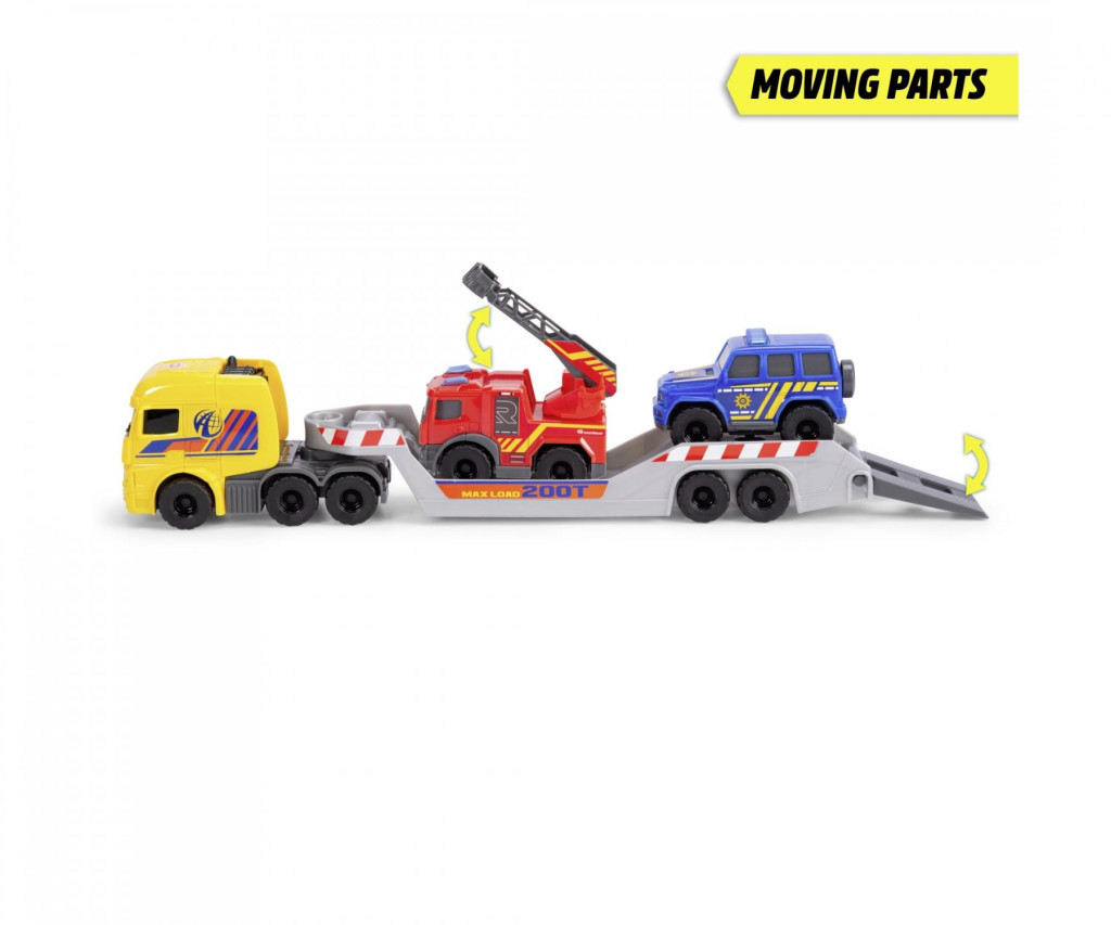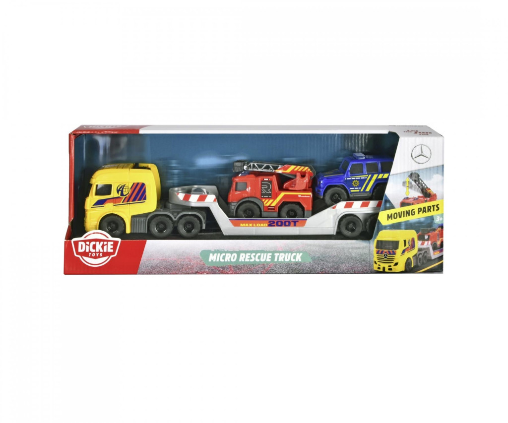 Készülj fel a gigantikus mentőakciókra! A Dickie Toys 3 az 1-ben mikro mentőautó-szett azonnal a helyszínre szállítja a város legfontosabb hőseit! Ez a 32 cm-es teherautó nemcsak egy hatalmas, sárga Daimler kamion (hivatalos licenccel), hanem egy teljes mozgó parancsnokság. A platón utazik ugyanis a Mercedes-Benz G-osztályú rendőrautó és a mozgatható létrás Mercedes-Benz Antos tűzoltóautó!