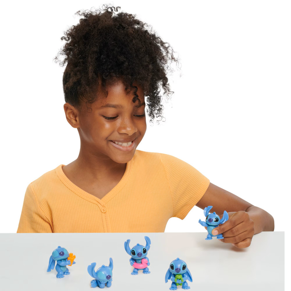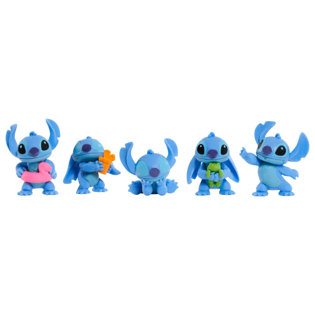 • 5 Póz, 5 Kaland: A készlet 5 különböző, imádnivaló pózban és kiegészítővel bemutatott Stitch figurát tartalmaz: Szuperhős Stitch, Földönkívüli Stitch, Angyal Stitch, Hula Táncos Stitch és Alapváltozatú Stitch, mely mellé még Scrump, Lilo kézzel készített babája is jár!