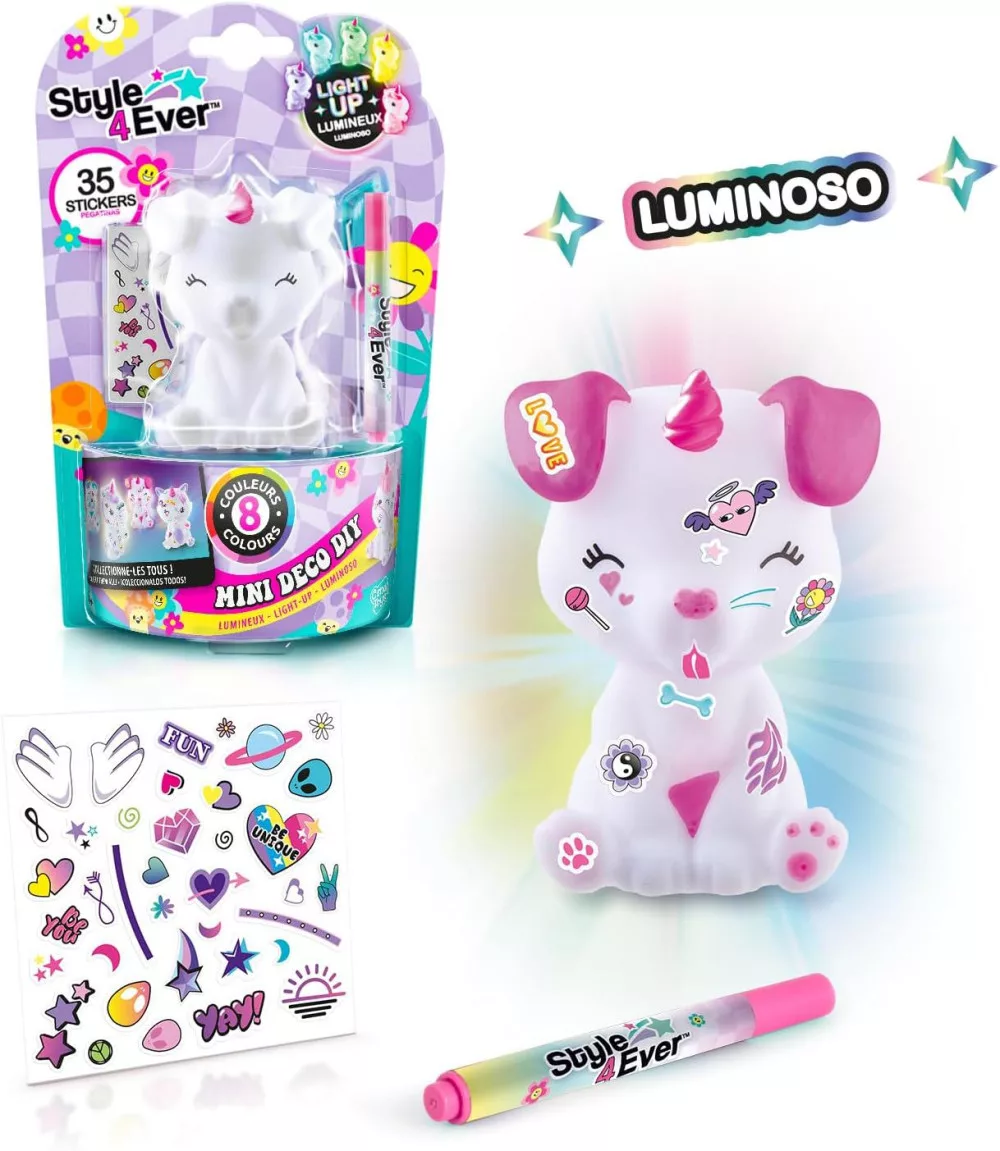 Díszítsd fel ezt a cuki sötétben világító figurát olyan egyedi stílusban, ami a legjobban illik hozzád! A készletben ehhez 35 izgalmas matricát találsz, plusz egy filctollat is, amivel még színesebbé és egyedibbé varázsolhatod a kis pajtásod. Ha a fények kialszanak, egyszarvú állatkád varázslatosan ragyog majd a sötétben!