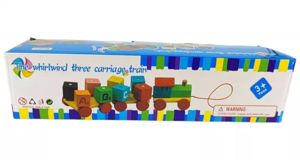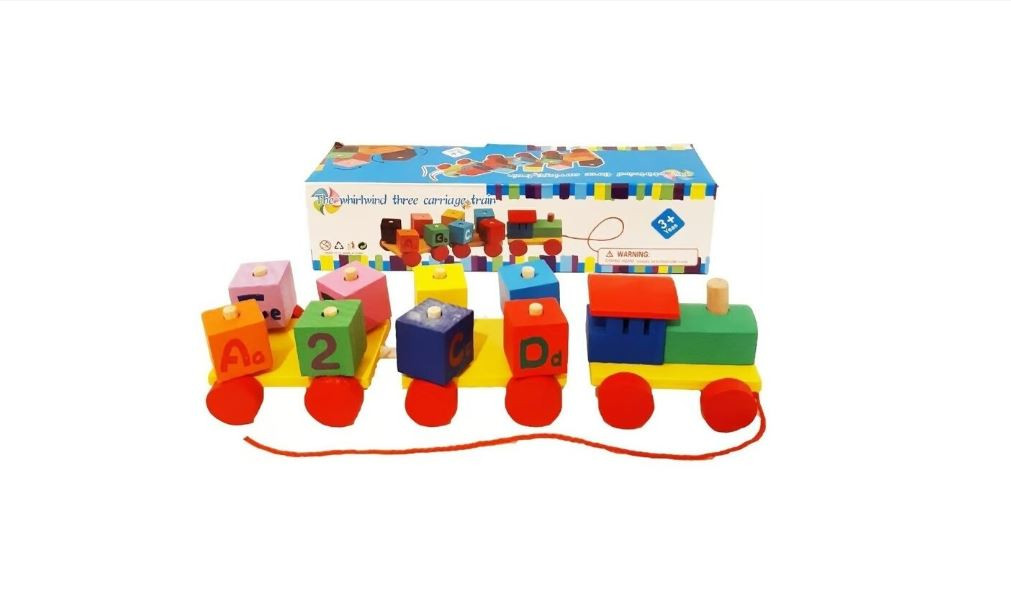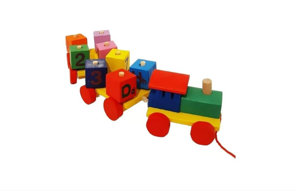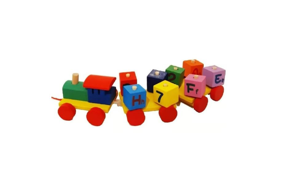 A mozdonyból és két vagonból álló vonat kockákat szállít, a kockákon színes számok és betűk vannak.