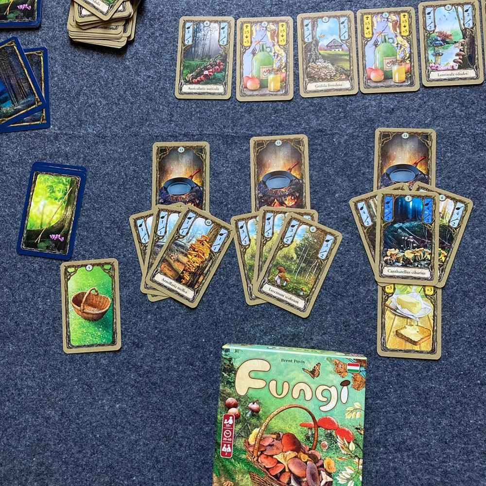 A Fungi, egy stratégiai kártyajáték két játékos számára, két paklit használ: egy nappali paklit (84 kártya), amely tíz különböző gombafajtát, valamint kosarakat, almabort, vajat, serpenyőket és holdakat tartalmaz; és egy kisebb éjszakai paklit (8 kártya) a holdfényben gyűjthető gombákból. Minden gombakártyának két értéke van: egy az eladáshoz és egy a főzéshez. Két vagy több hasonló gomba eladása gyűjtőpálcákat ad, amelyek bővítik a lehetőségeidet az erdőben (vagyis az asztalon lévő nyolc felfordított kártyából álló futó tablót), és lehetővé teszik a támadó vagy védekező játékokat, amelyek minden egyes játszmával változnak. Három vagy több hasonló gombából álló készletek főzése – vajban vagy almaborban sülve, ha a készlet elég nagy – pontokat ad a játék megnyeréséhez. Mivel a mérges gombák haragjukkal és a kézméret-korlátozással kell megbirkózni, a kártyaválasztás minden fordulóban trükkös feladat.