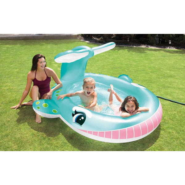 Nincs is jobb, mint pancsolással tölteni a forró nyári délutánokat a kertben. Ebben a kedves, bálna alakú medencében garantált a szórakozás már csak azért is, mert ha rákötjük a kerti slagot, a bálna vizet fröcsköl az árnyékolóként is funkcionáló uszonyából.