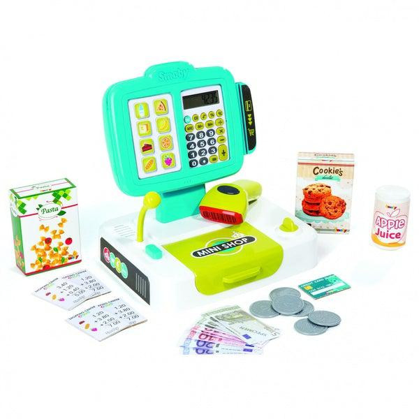 A játék pénztárgép beépített digitális számológéppel rendelkezik. A kasszája nyitható, vonalkód leolvasója, mikrofonja van. A műanyag pénztárgép fény- és hanghatásokkal felszerelt. A csomagolás a bevásárlós játékhoz szükséges egyéb kiegészítőket is tartalmaz, megvásárolható termékeket, bankkártyát és készpénzt is. A terméket 3 éves kortól ajánljuk.