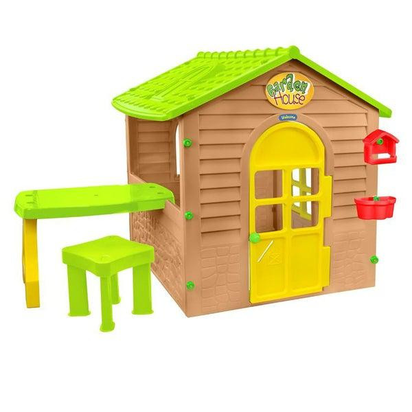 Az kerítéssel ellátott teraszos, zöld színű kerti játékházban szabadon játszhatnak a gyerkőcök akár egyedül, akár a barátaikkal. Bevihetik kedvenc játékaikat és élvezhetik az árnyékot, amit a játékház biztosít számukra.