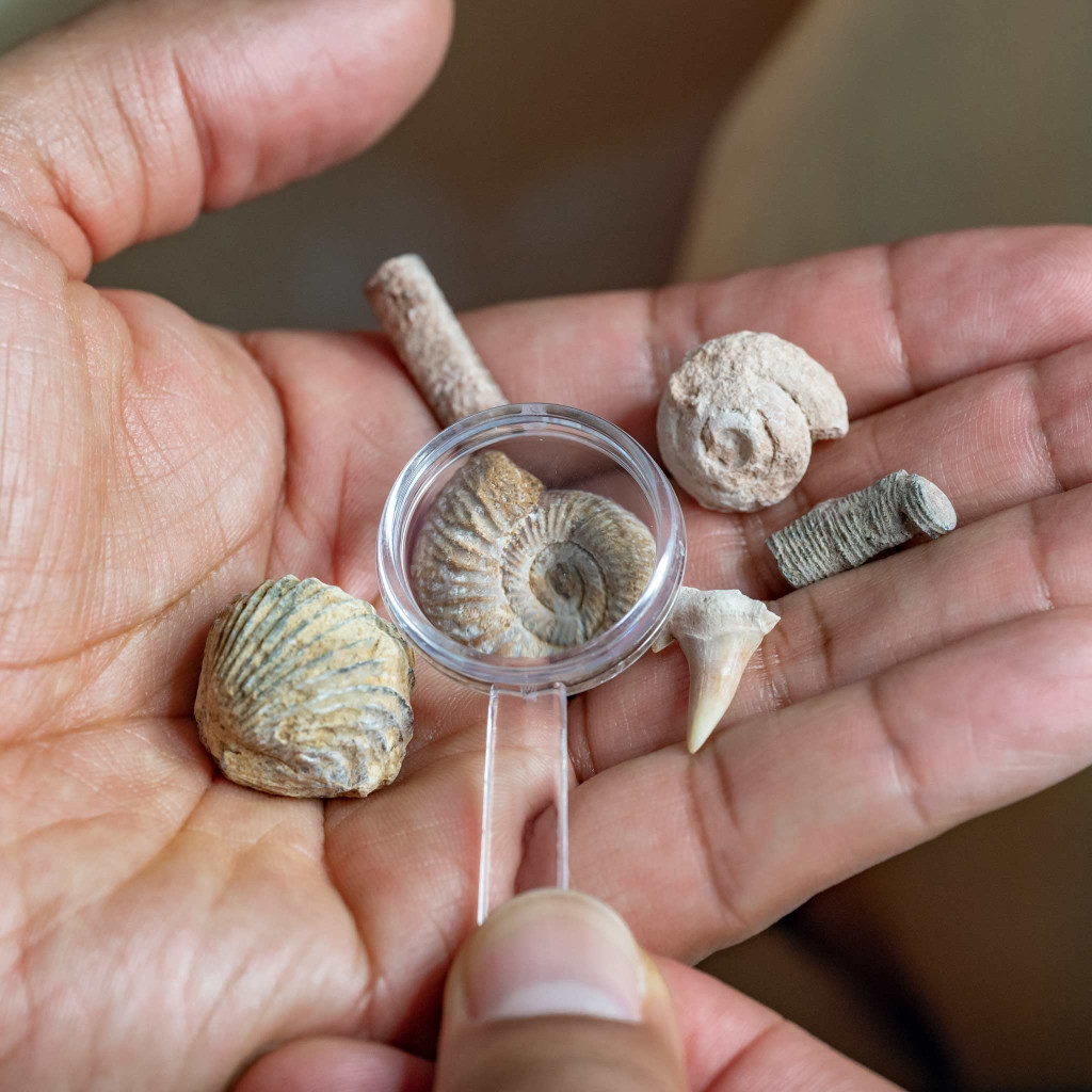 • Tanulmányozd: Vizsgáld meg a kövületeket a nagyítóval, és fedezd fel a részleteiket.