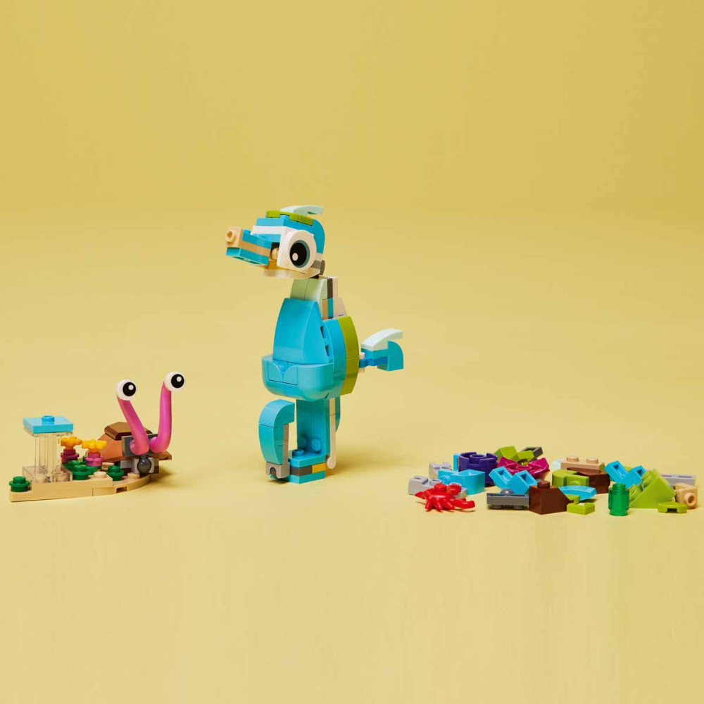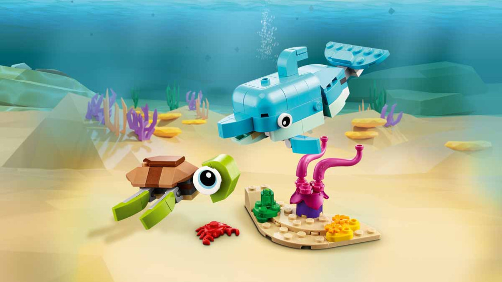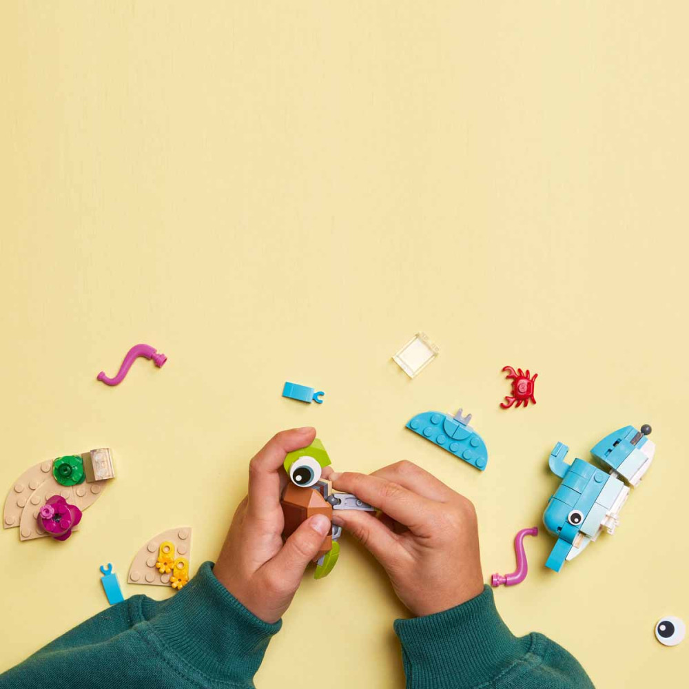 A LEGO Creator 3 az 1-ben készlet 3 tengeri állatával a víz alatti szórakozás soha nem ér véget. A gyerekek építhetnek beállítható delfint és teknőst, amiket állítható csikóhallá és tengeri csigává vagy egy rákkal úszkáló szép hallá építhetnek át, de akár egy teljesen új állatot is alkothatnak.
