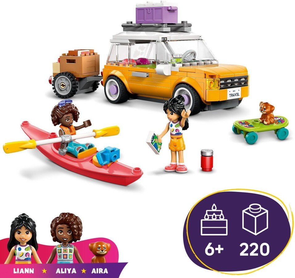 Nyiss meg a gyerekek előtt egy kalandokkal teli világot a 6+ éves lányoknak és fiúknak szóló LEGO® Friends Autós kirándulás a barátokkal (42659) építőszett segítségével! Ez az eseményekkel teli készlet egy utánfutós autót, 2 LEGO Friends minibabafigurát, egy aranyos kutyafigurát és rengeteg kiegészítőt tartalmaz, hogy még vidámabban teljen a játékidő. Küldd a gyerekeket egy kreatív utazásra, miközben segítenek Liann-nek és Aliyának bepakolni az autóba és felpakolni mindent a lecsatolható utánfutóra, amire a kiránduláshoz szükségük lesz. A barátok elől ülnek, amíg Aira, a kutya az autó hátuljában. A kiegészítők közt kajakot, 2 sisakot, gördeszkát, görkorcsolyát, 2 széket, szendvicseket rejtő hűtőt, fánkot, sütit, cseresznyéket és jutalomfalatot találsz. Ha ennétek valamit, akkor a hűtő piknikasztallá alakítható. Fedezz fel még több (külön kapható) szociális-érzelmi fejlődést támogató építőjátékot a LEGO Friends világában! A szetthez hozzátartozik a LEGO Builder app is, amely az intuitív építést biztosítja: a gyerekek a modelleket felnagyíthatják és elforgathatják, szetteket menthetnek el, és építés közben nyomon követhetik a haladásukat.