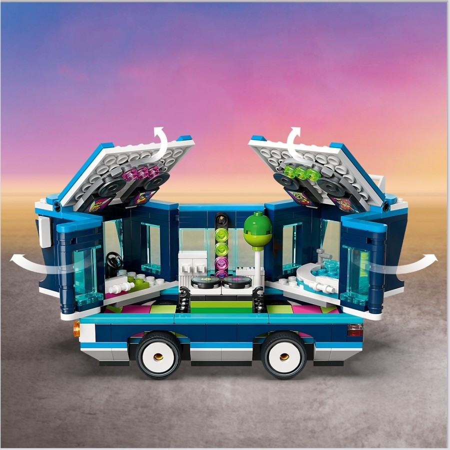 • Kreatív építés és játék – A kiegészítők, mint az elektromos gitár, a zongora, a mikrofon, a lámpák, a hangszórók, a monitorok, a zászló, a léggömb, a kalapok, a fagylalt és az innivalók mind inspirálják a fantáziadús játékot