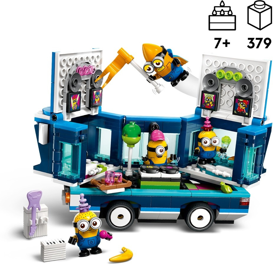 • Játék busz minyonokkal – Tartalmaz egy megépíthető, tologatható buszt, amely egy mobil bulihelyiséggé változik a 4 LEGO® minyonfigura számára: Phil, Mel, Dave, és a magasan repülő, mega minyon, Guszti
