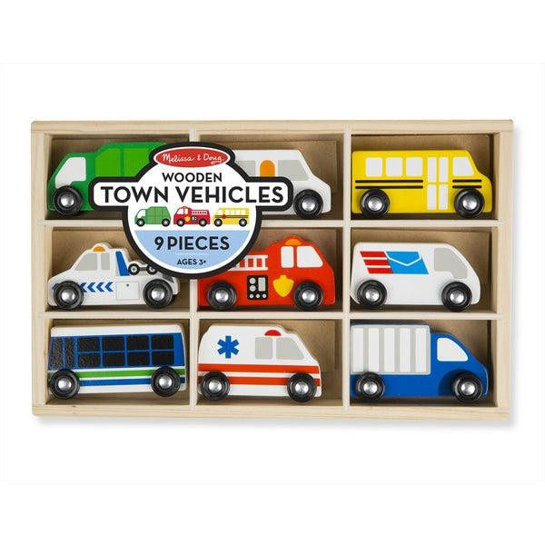 A 9 darabos készlet tartalmaz kukás kocsit, vontató kocsit, postás autót, iskolabuszt, tűzoltó autót, jégkrémes autót, és teherautót. A játékok mérete kb. 10 cm hosszú és mindegyik könnyen felismerhető, élén színekkel festett.