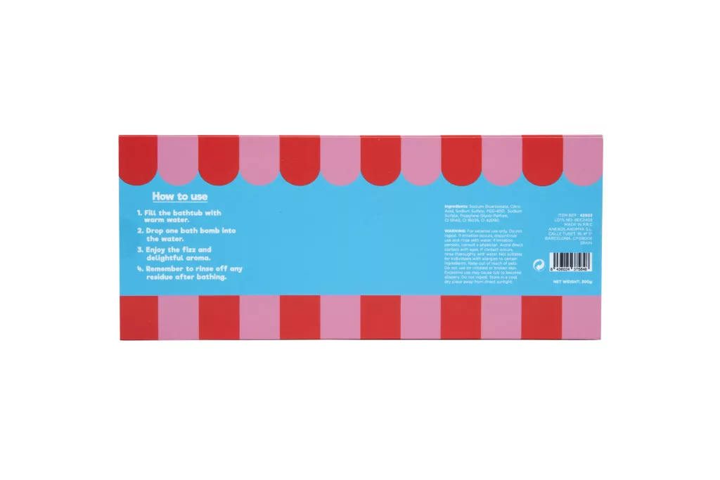 Fő összetevők: Nátrium-hidrogén-karbonát, Citromsav, minőségi illatanyagok és biztonságos kozmetikai színezékek.