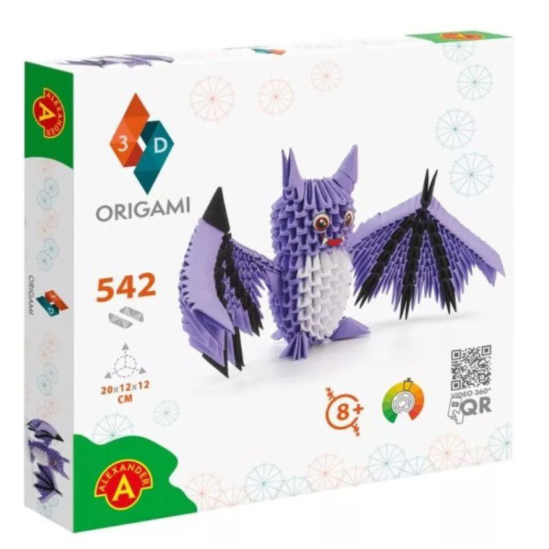 Ezzel az Alexander 3D origami készlettel a kreatívkodni vágyó gyerekek 542 papírdarabból készíthetnek el egy csodálatos denevért. A papírszobor összeállítása - a részletes leírásnak és a bemutató videónak köszönhetően - egyszerű. Az előre vágott formák egyértelműen jelölt hajtásvonalakkal rendelkeznek, így néhány egyszerű mozdulattal elkészíthetőek a szobor alapjaként szolgáló papírelemek. A 3D-s figura ragasztó nélkül is egyben marad.