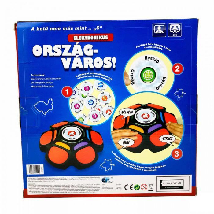 Az Ország - város elektromos társasjáték egy igazán pörgős játék, egyszerű és szórakoztató. Hozz egy gyors döntést és gondolkozz gyorsan. Helyezd a kártyát a játékegységre és indulhat a játék. A játékegység kiválasztja a betűt és azzal a betűvel kell mondani egy szót minél gyorsabban kártyán látható témában. Az a játékos, aki először nyomja meg a gombot, ő válaszolhat. Ha a válasz helyes, akkor elhozza a kártyát. Az győztes, aki a legtöbb kártyát gyűjti össze.