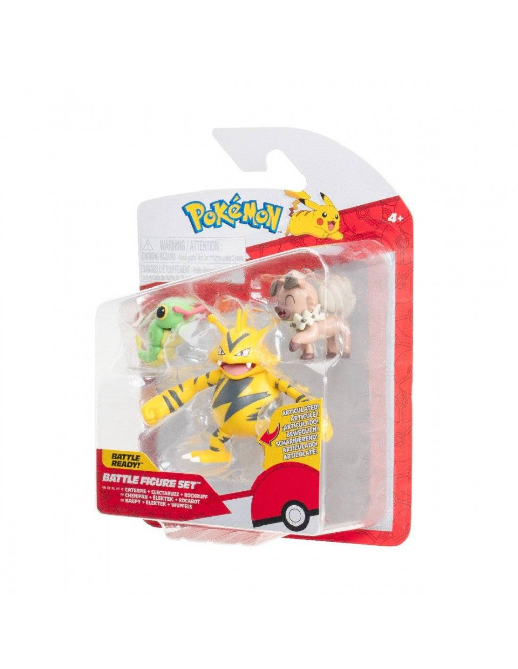 Műanyag Pokémon battle figura készlet – Caterpie, Rockruff és Electabuzz szerepel benne.