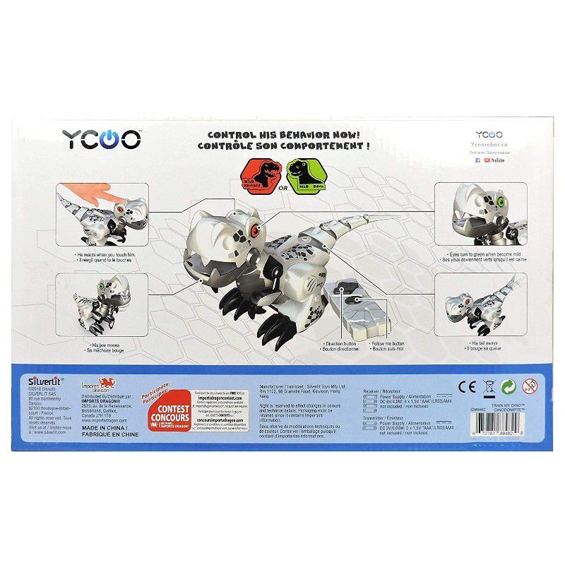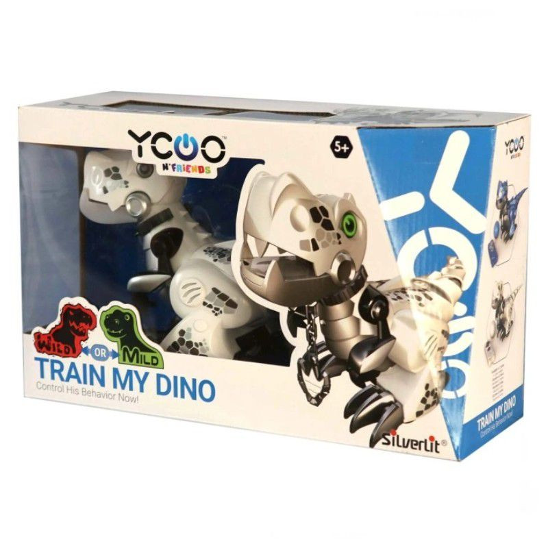 A Silverlit Train My Dinos – Így neveld a dinód egy távirányítóval vezérelhető őslény, akit a gyerekek taníthatnak is játék során.A robot dinó két üzemmódban használható. A Wild módban a dinoszaurusz mozgása és reakciója véletlenszerű lesz, miközben szórakoztató hangokat ad ki. A Train mód lehetővé teszi, hogy más módon kommunikáljanak vele: a fejét megérintve a dinó követni fogja a kézmozdulatokat. A beépített intelligens érzékelők reagálnak a távirányítóra és a dinó ki tudja kerülni az előtte lévő akadályokat.A kis dinoszaurusz kerekeken gurul, szemei világítanak. Üzemmódot váltva a szemszín is megváltozik. A távirányító kőhöz hasonlító megjelenése is az őslények világát hozza el a kicsiknek. A gyerekek akadálypályát készíthetnek neki vagy labdát is guríthatnak, ez a robot dinó a legmókásabb játszótársuk lesz!A Train My Dinos fehér színben kapható.