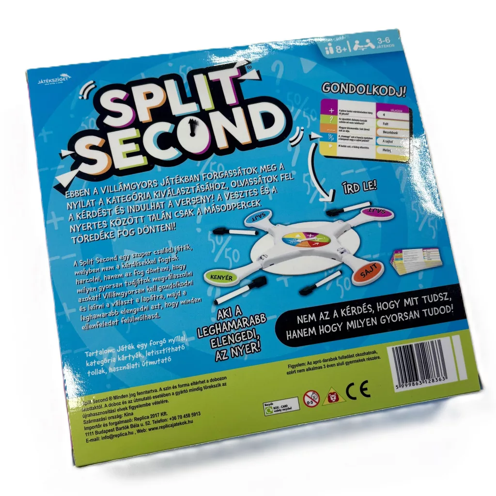 Unalmasak a kvízjátékok, ahol mindig ugyanaz a lexikális tudású családtag nyer? Készen állsz egy olyan pörgős, vidám és igazságos versengésre, ahol a reflexek és a gyors gondolkodás mindent visznek? Bemutatjuk a Split Second-et, a villámgyors válaszok partijátékát, ami garantáltan a családi és baráti összejövetelek új kedvence lesz!