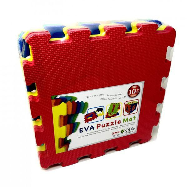 A 10 darabos puzzle piros, sárga, kék, zöld és narancssárga habszivacs lapokat tartalmaz.