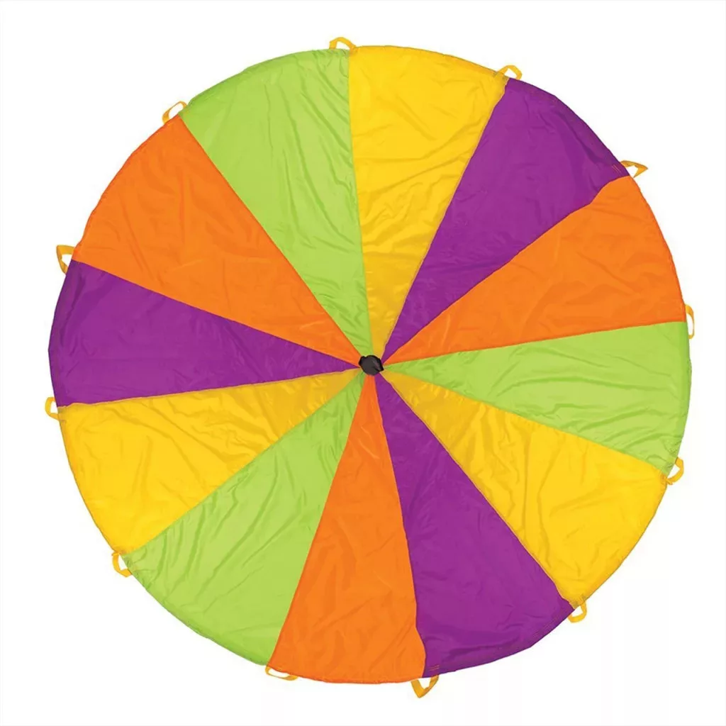Wonderland ejtőernyős kültéri játék csapatnak, 12 fogantyúval. A színes ernyő átmérője 305 cm.